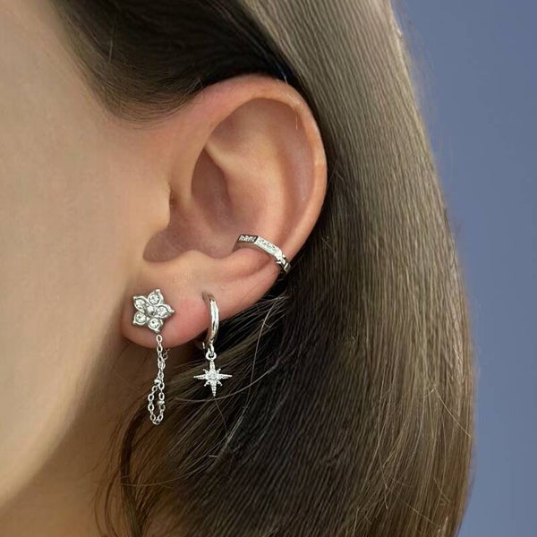 La mono-boucle Poinsettia est tendance et stylé, elle se compose d'une parti haute en forme de fleur à strass et d'une chaine en acier inoxydable reliant la fleur et le fermoir papillon.